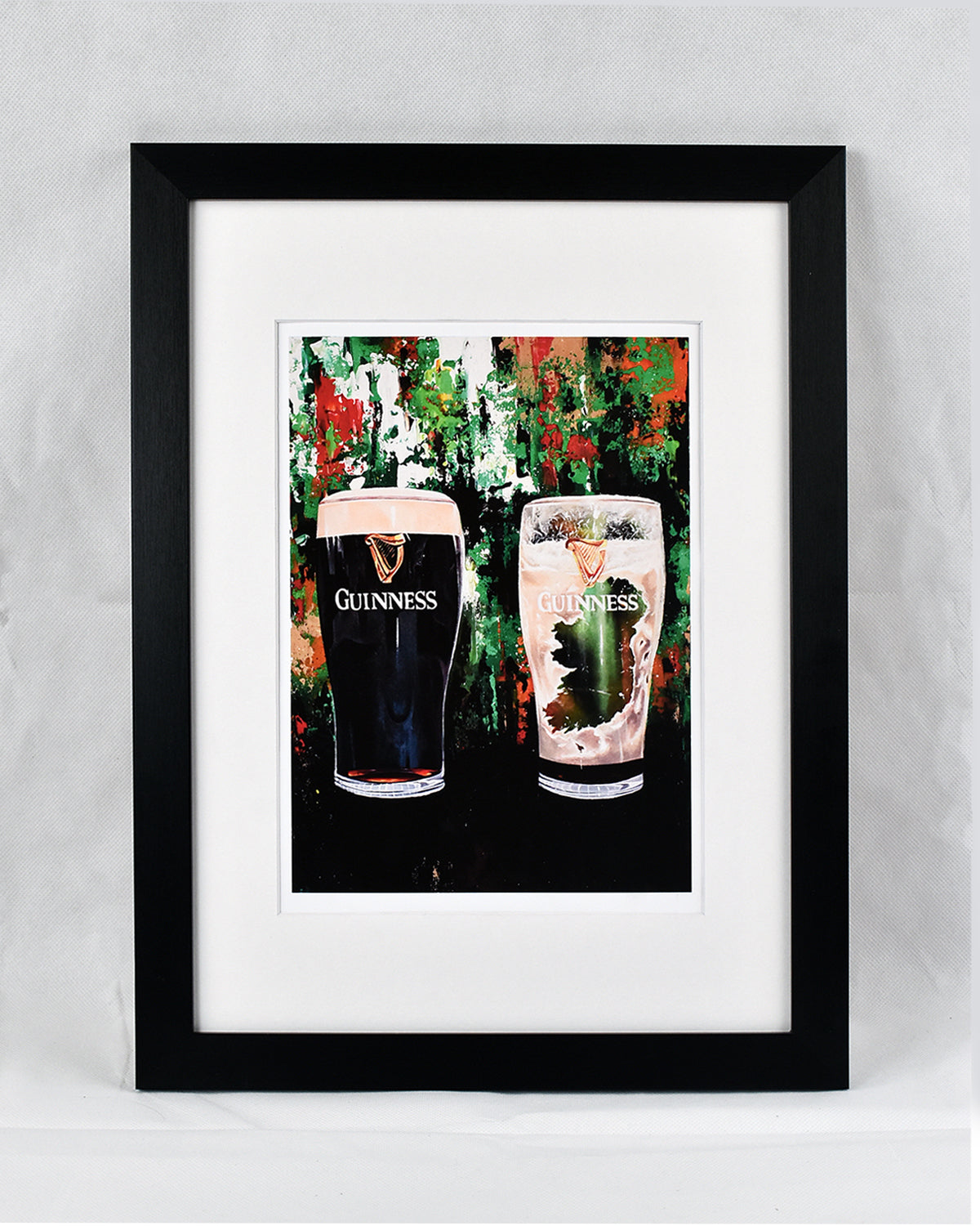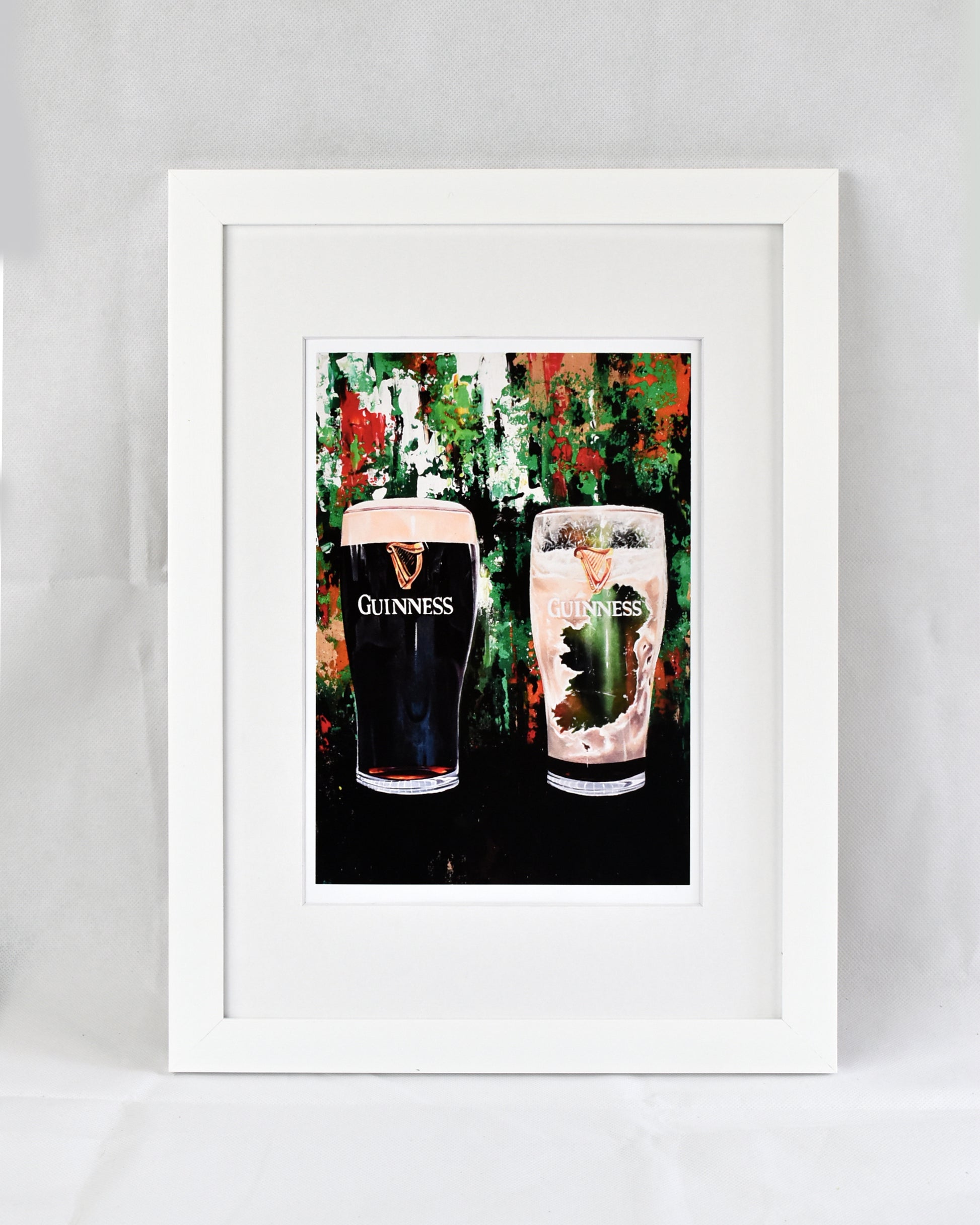 Each print is professionally mounted in a frame one size larger, creating a clean, gallery-style white border around the artwork. For example, an A4 print is framed in an A3 frame.
